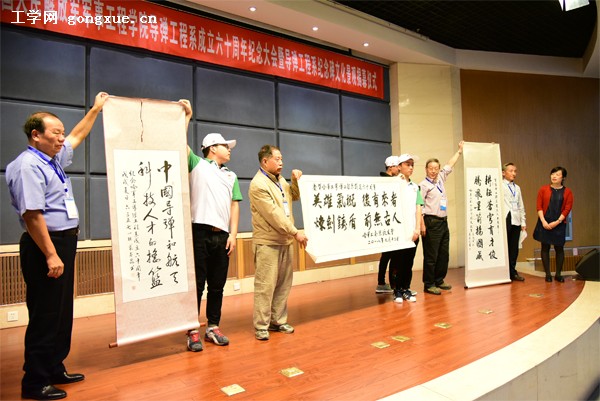 南京、杭州、65级校友会代表向哈军工纪念馆敬赠墨宝,筹备组代表向各地校友会代表赠送纪念章。