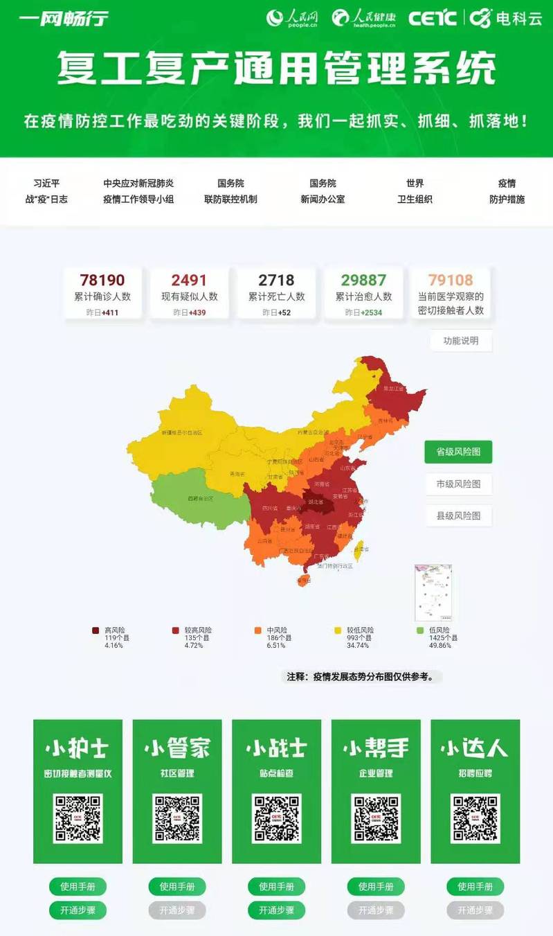 据孟庆昕介绍,复工复产通用管理系统具备数据权威、评估精准、体系联动、有效防控四大特点。该系统汇聚了卫健、公安、铁路、民航、交通等部门870万余条实时数据;提供覆盖全国、省、市、县四级的疫情研判指挥平台,精准判断区域风险等级,辅助各级领导决策;配备了密切接触者测量仪、社区楼宇“小管家”、交通站点“小战士”、企业复工“小帮手”、找工作招工人“小达人”五个客户端软件,实现社区楼宇、交通站点、部门企业“三体”联动,形成“横向到边、纵向到底”的责任防御体系,构筑严密防线,一手抓疫情防控,一手抓复工复产。