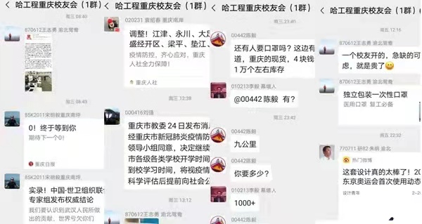 在校友陆续反馈的需求中,口罩是大家集中反映最急需的物资,因此重庆校友会紧急行动起来,前后对接10余家国内外口罩销售渠道,甄别真伪、密切沟通,其中他们遇到了下单被退回、涉嫌欺诈等等各种复杂情况,但重庆校友会始终本着为校友们提供稳定可靠物资渠道的信念,经过加班加点的不懈努力与准确核实,最终确定了几家可靠的物资渠道,确保了校友们需求得到满足。截至目前,重庆校友会共为当地100多位校友解决了22000个口罩的需求,校友们纷纷表示,在患难之中,重庆校友会想校友之所想,是大家最可依赖的坚强后盾和温暖的家。