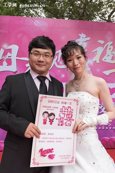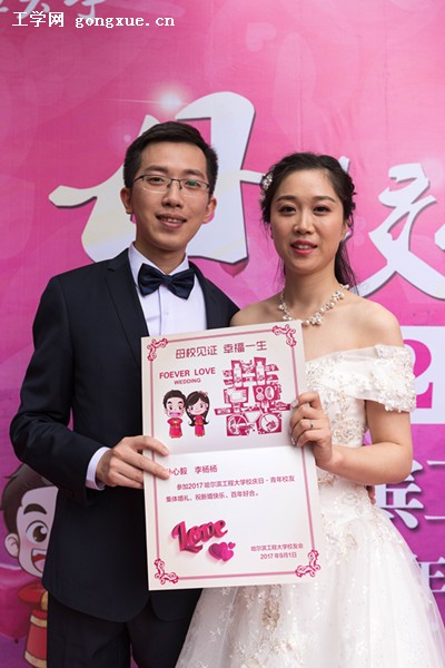 孙心毅,从2003年入学到2014年博士毕业,在学校水声学院就读11个年头,目前是某部队的一名现役军人。孙心毅说,“当年大一刚步入校门身穿迷彩军装参加军训,心里便萌发要当一名军人的念头,可以说我的从军梦来源于我的母校。”这一次是孙心毅毕业三年后第一次回到母校,看到学校日新月异的变化,“助学超市面积扩大了,东西的品种多了;新的学生公寓设施更完善了;61号楼已经落成并投入使用……学校的建设越来越人性化、越来越高大上,真想再重回母校上学。” 新娘李杨杨开玩笑地说:“见到美丽的学校,见到孙心毅的老师和同学,这里的景美、人更美,嫁给他我更放心了。”