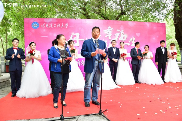 学校终身示范主讲教师于涛携手妻子姜虹上台为曾经的学生送上祝福:“结婚以后你们互敬互爱,互包互容,努力共建甜蜜美满的‘小家’;孝敬子女,照顾和谐幸福的‘大家’;发扬‘大工至善、大学至真’的校训精神,在工作岗位努力拼搏,建设好安定强盛的‘国家’。”