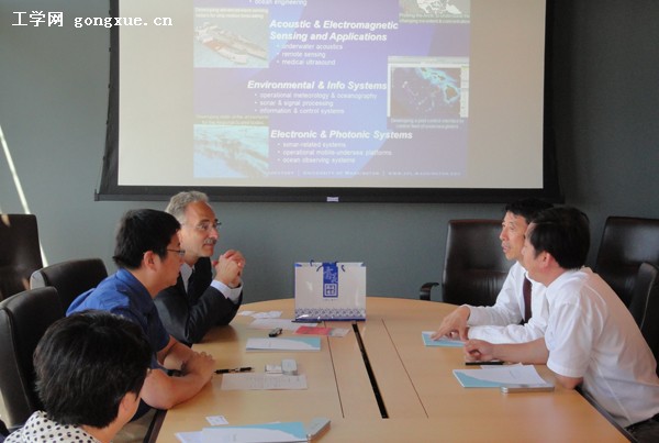 在华盛顿大学,谷焕民和该校应用物理实验室执行主任杰弗里·A·西蒙教授共同回顾了两校相关学科近20年的合作历史。西蒙教授为代表团展示了水下无人潜器、海底观测系统等该实验室最新科研成果以及一些研究成果转化的具体实例,并表示欢迎我校相关学科学者、研究生到该实验室进行合作研究。