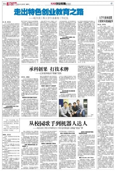 近年来,我校逐渐形成了具有鲜明特色的创业教育工作模式,即“围绕一个核心,坚持两个结合,着力构建四个平台”,即以育人为核心,为学生的全面发展和健康成长创造一流的校园环境;坚持创业教育和创业实训相结合,坚持普及与提高相结合;着力构建大学生创业理论平台,着力推进大学生创业竞赛平台,着力开创大学生创业实训平台,着力打造大学生创业孵化平台。学校涌现出郭天祥、于欣龙、宋超等一大批创业精英,以及哈尔滨祥鹏科技有限公司、哈尔滨奥松机器人有限公司、杭州微触科技有限公司等实体企业,并屡屡在创业大赛中摘金夺银。学校先后三年荣获“全国青年就业创业教育先进集体”、大学生创业联盟连续三年荣获“全国十佳KAB俱乐部”。
