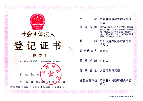 4年5日,广东省哈尔滨工程大学校友会获广东省民政厅批准颁证。这是我校第三个获地方民政部门批准成立的地区校友会,具有独立法人资格。广东省哈尔滨工程大学校友会的成立,正是适应了母校事业发展的需要,反映了广大校友的期盼和心声,它必将为广大校友之间加强联系提供广阔的交流平台和坚强的组织保障,为母校的未来发展提供更有力的支持。校友会不仅联系着学校的过去、现在和将来,更承载着母校与广大校友共同的光荣与梦想。
